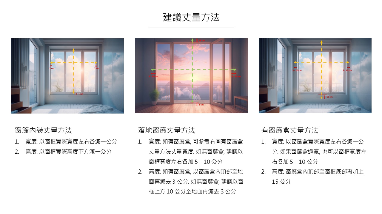 缺點: 需自行丈量與安裝, 如丈量失誤導致尺寸不合或安裝失誤, 使用者須自行承擔風險